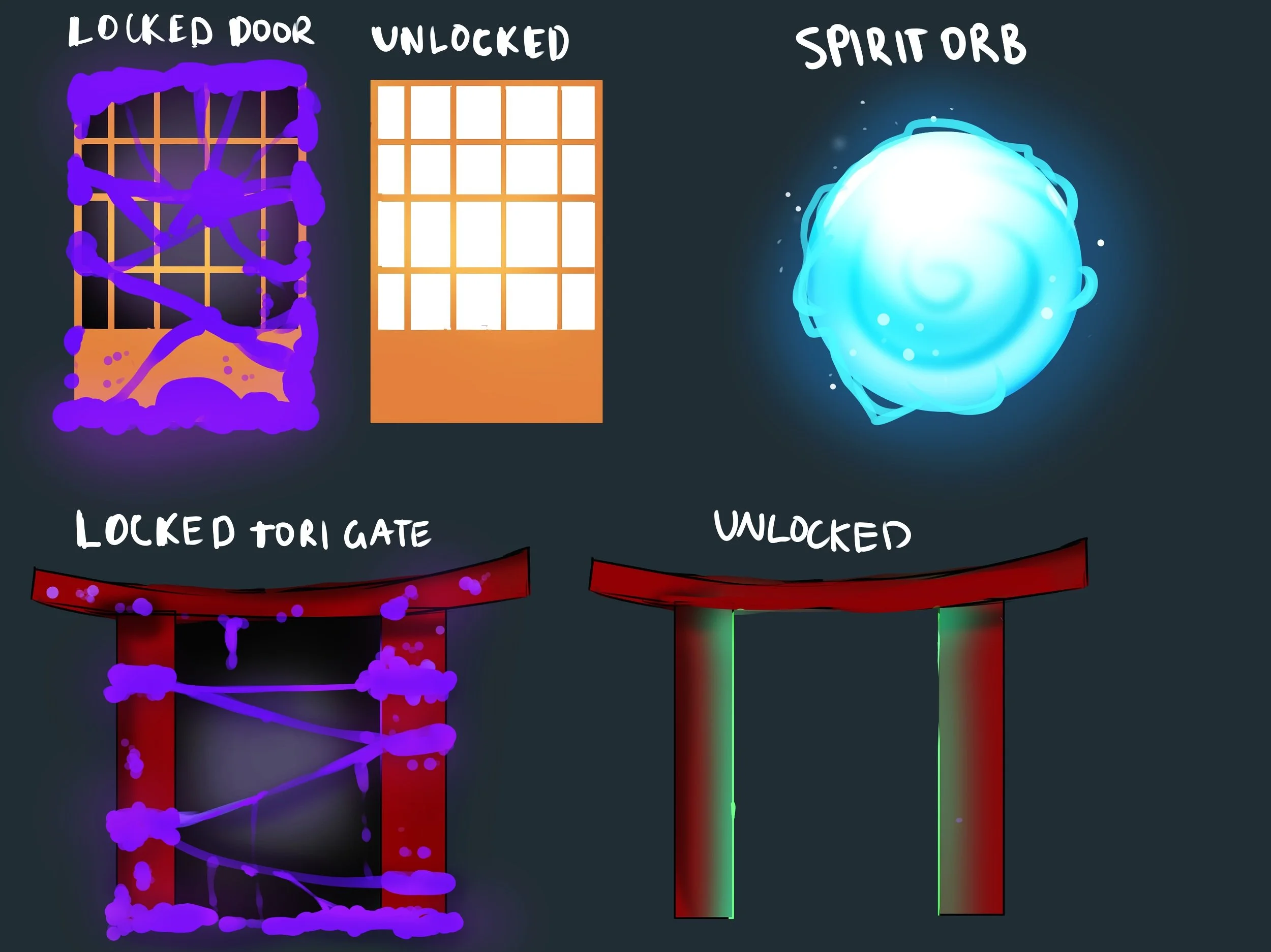 Here’s the final logo design for the project, which has the ancester spirit embedded in it with a Japanese tori gate in the background to represent the setting of the game.